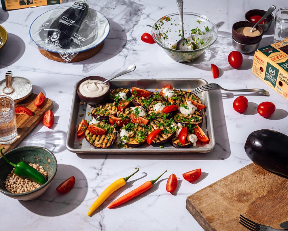 Asettele grillatut munakoisot tarjoiluvadille yhdessä tomaattilohkojen kanssa. Pirskottele päälle loput marinadista.