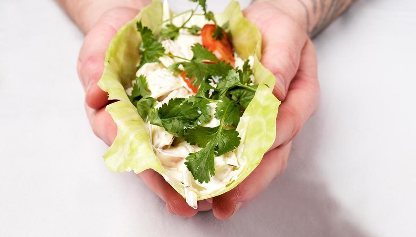 - Kasaa ”tacot” nostele keitetyille kaalinlehdillekaali-tomaattitäytettä ja koristele korianterilla.