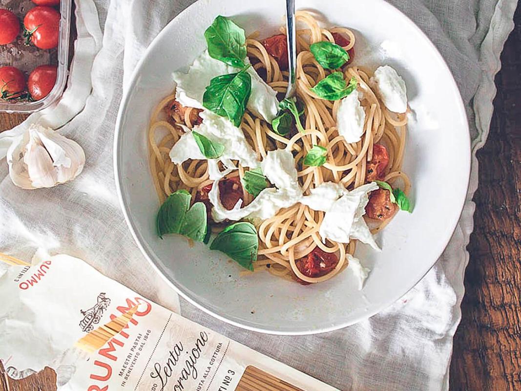 Kesäpasta mozzarellalla ja kirsikkatomaateilla