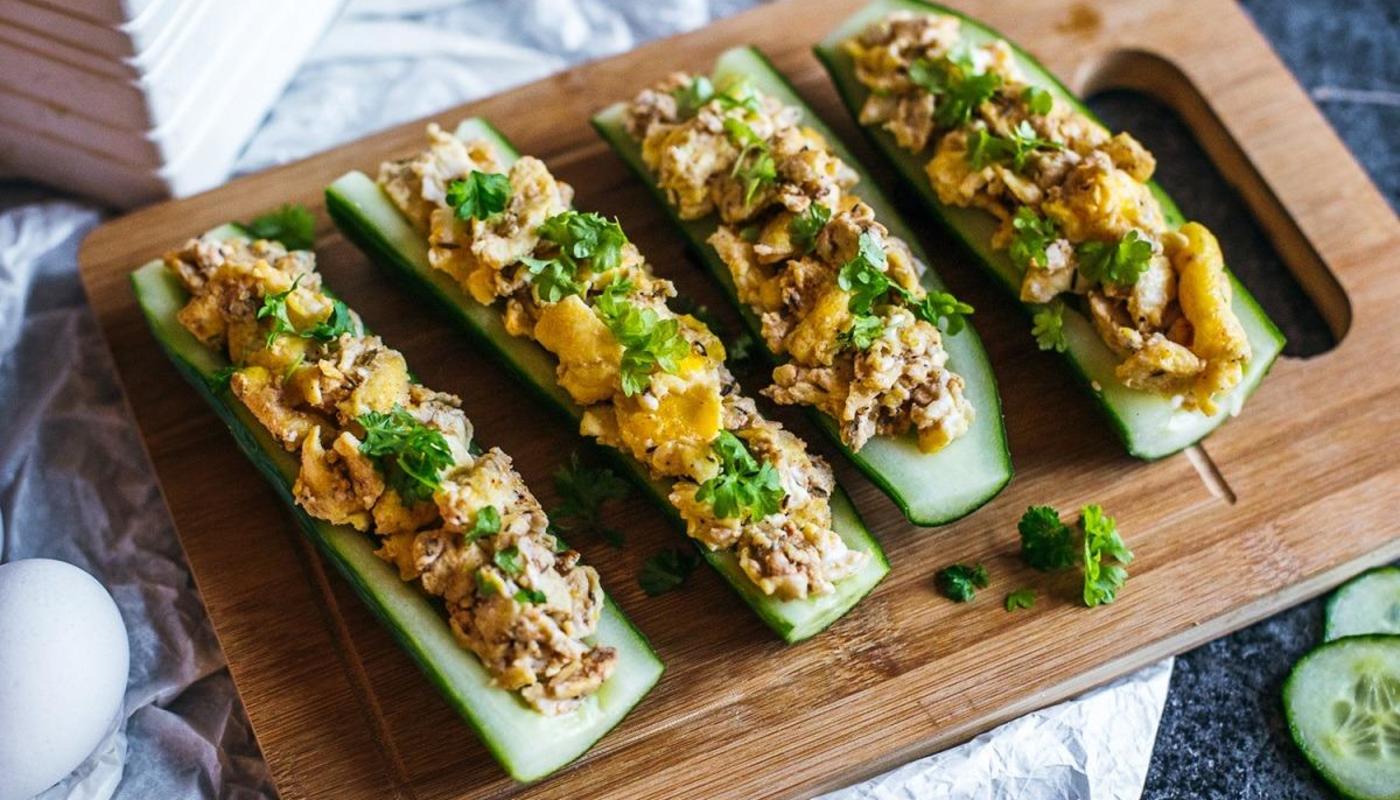 - Täytä ”kurkku-veneen” munakokkelilla.
