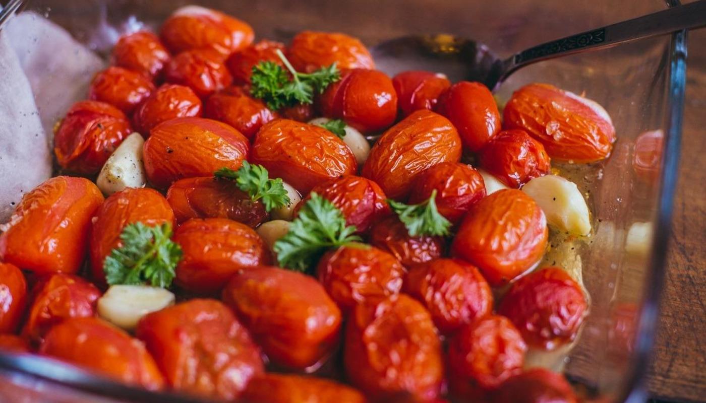 - Laita tomaatit uunivuualle, kaada päälle öljyä ja lisää mausteet.