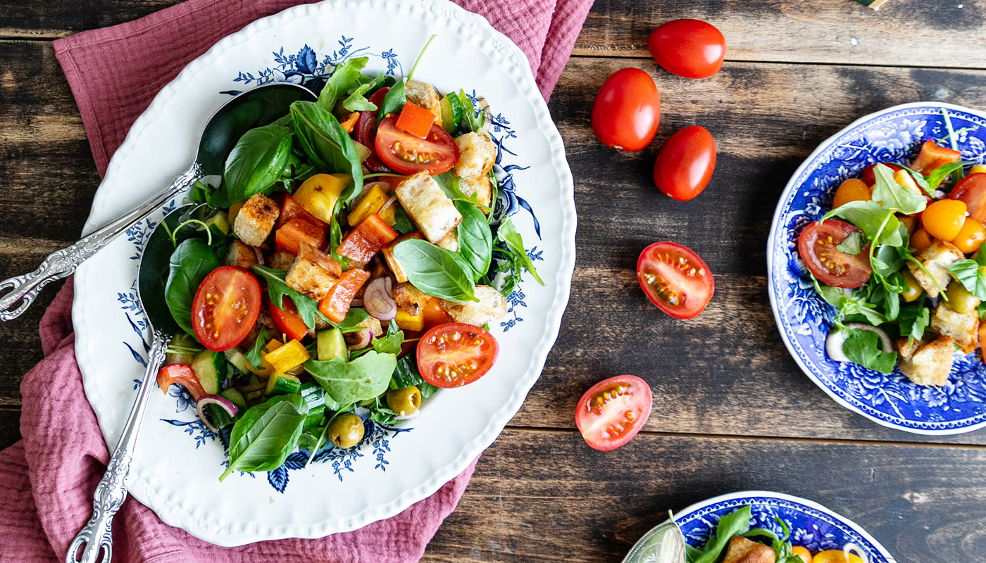 Panzanella on helppo ja ruokaisa toscanalainen tomaatti-leipäsalaatti, johon voit käyttää pöydälle unohtuneet vähän kuivahtaneet leipäviipaleet (myös gluteeniton leipä sopii tähän hyvin).