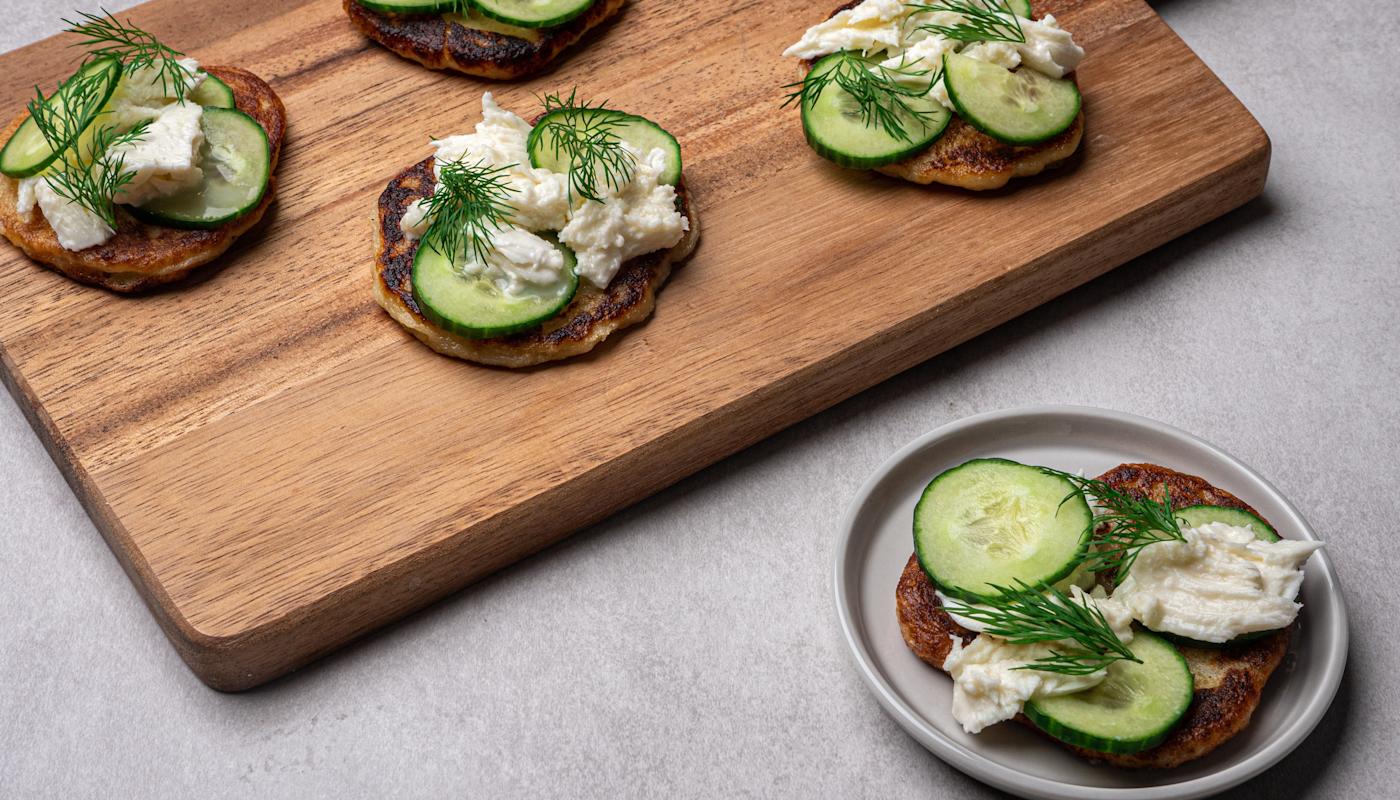 - Laita rieskojen päälle kurkkua, mozzarellaa ja tilliä.