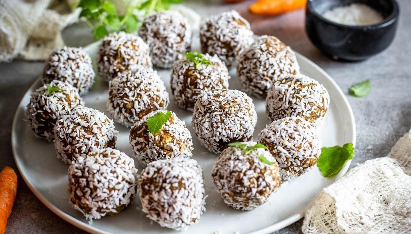 Ihanan hyviä taatelipalloja porkkanakakkumaulla.