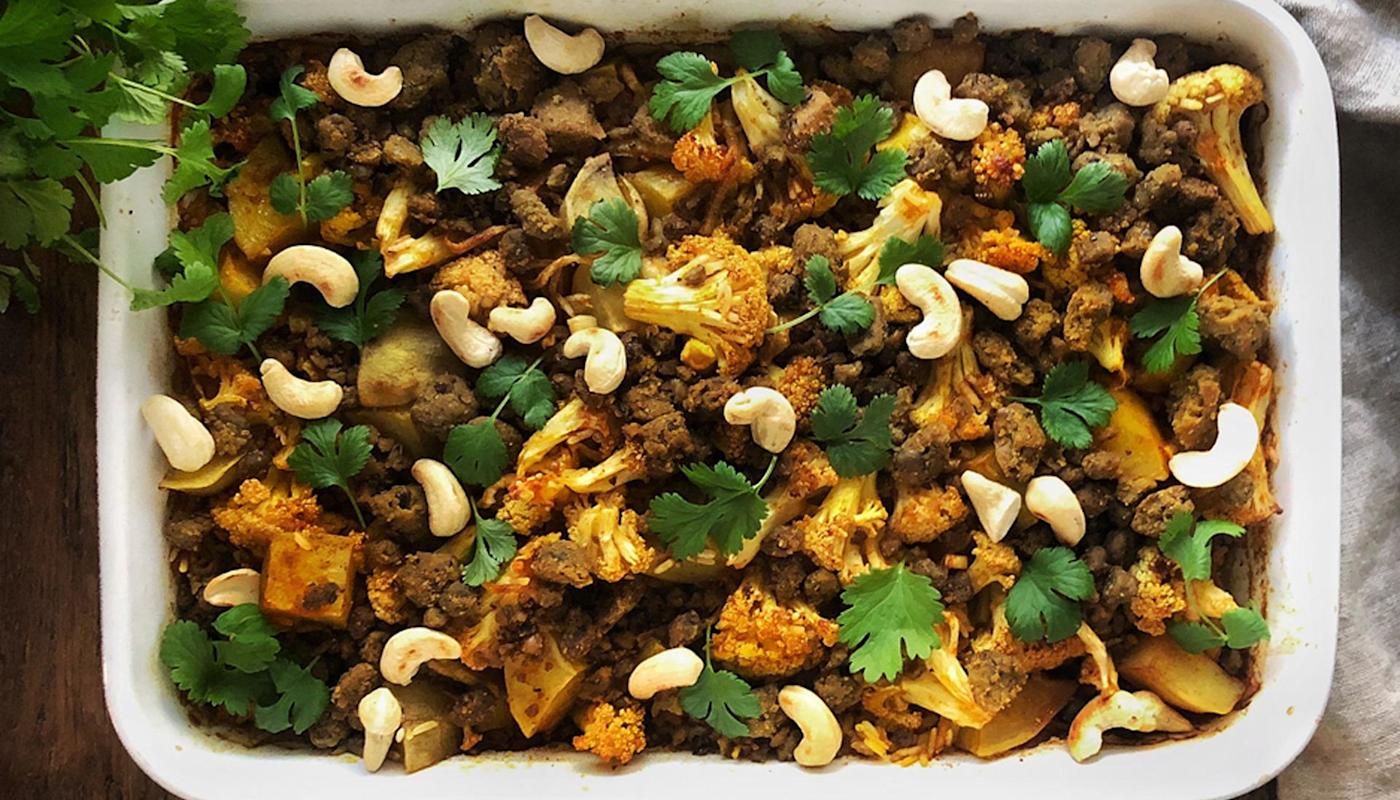 Tämän vuokaruoan jekku on mausteissa, joita on runsaasti, ei kuitenkaan liikaa. Ruoan voi rikastaa melkeinpä millä tahansa proteiinipitoisella, kuten härkiksellä. Annos kruunataan paahdetuilla cashewpähkinöillä, tuoreella korianterilla ja nokareella kasvipohjaista ranskankermaa.