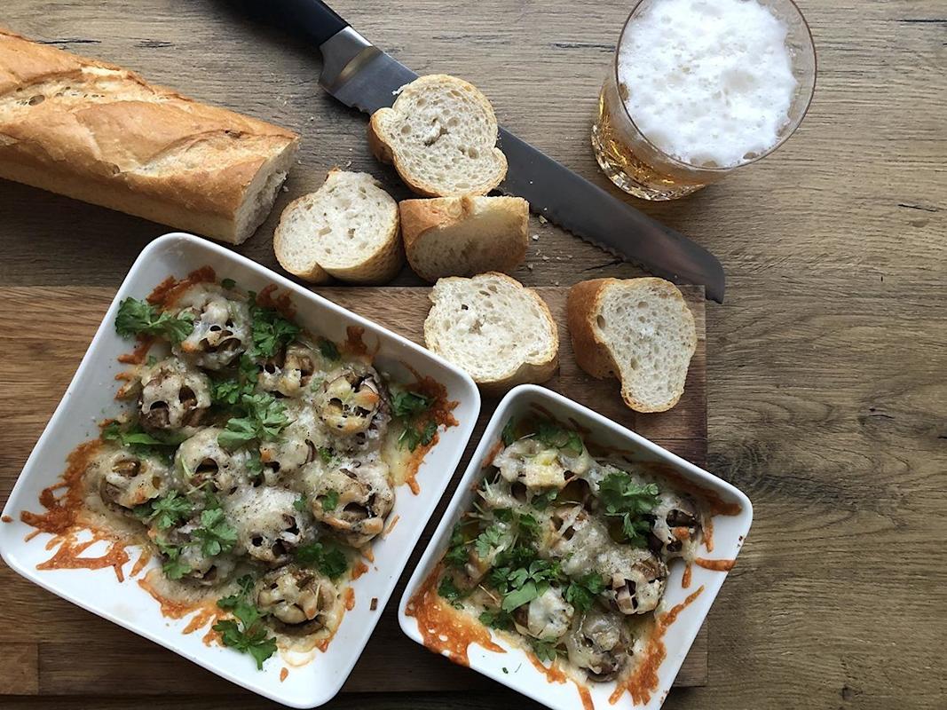 Kuorutettuja herkkusieniä valkosipulilla ja manchego-juustolla.