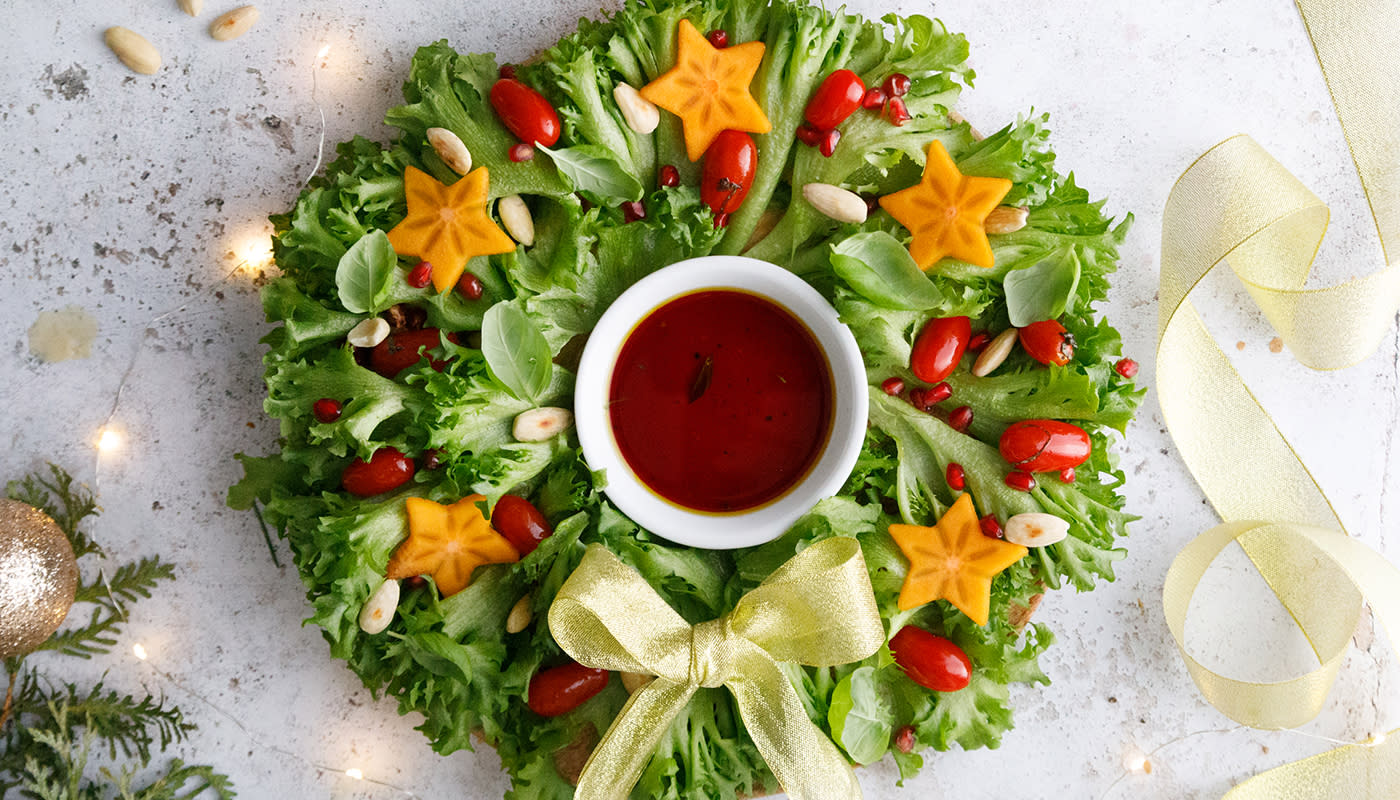 Salaattikranssi ja glögimarinoidut tomaatit on todella helppo tehdä ja voit koristella sen täysin oman makusi mukaan! Marinadia voi myös muokata sesongin mukaan.
