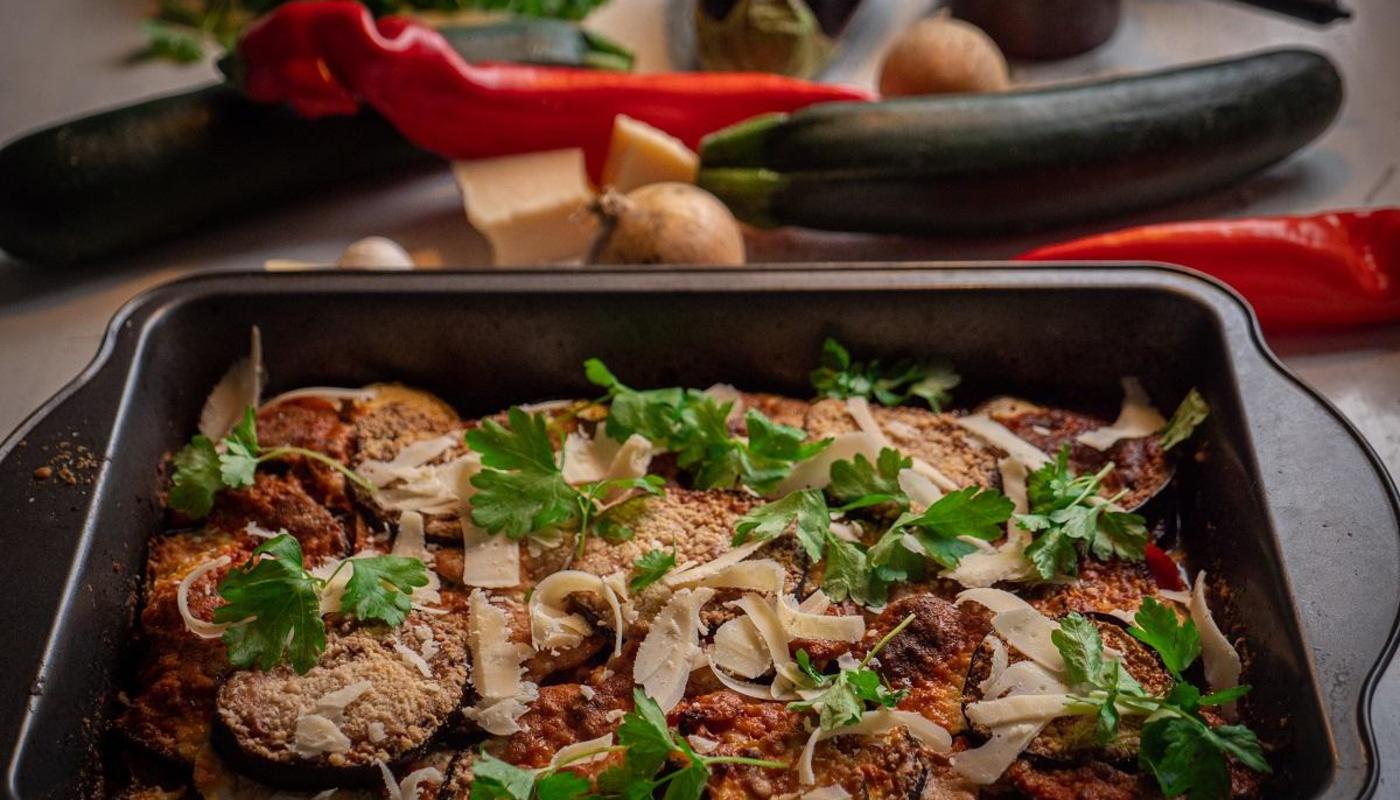 - Varva i en ugnsform tomatsås, äggplanta, zucchini och paprika.
