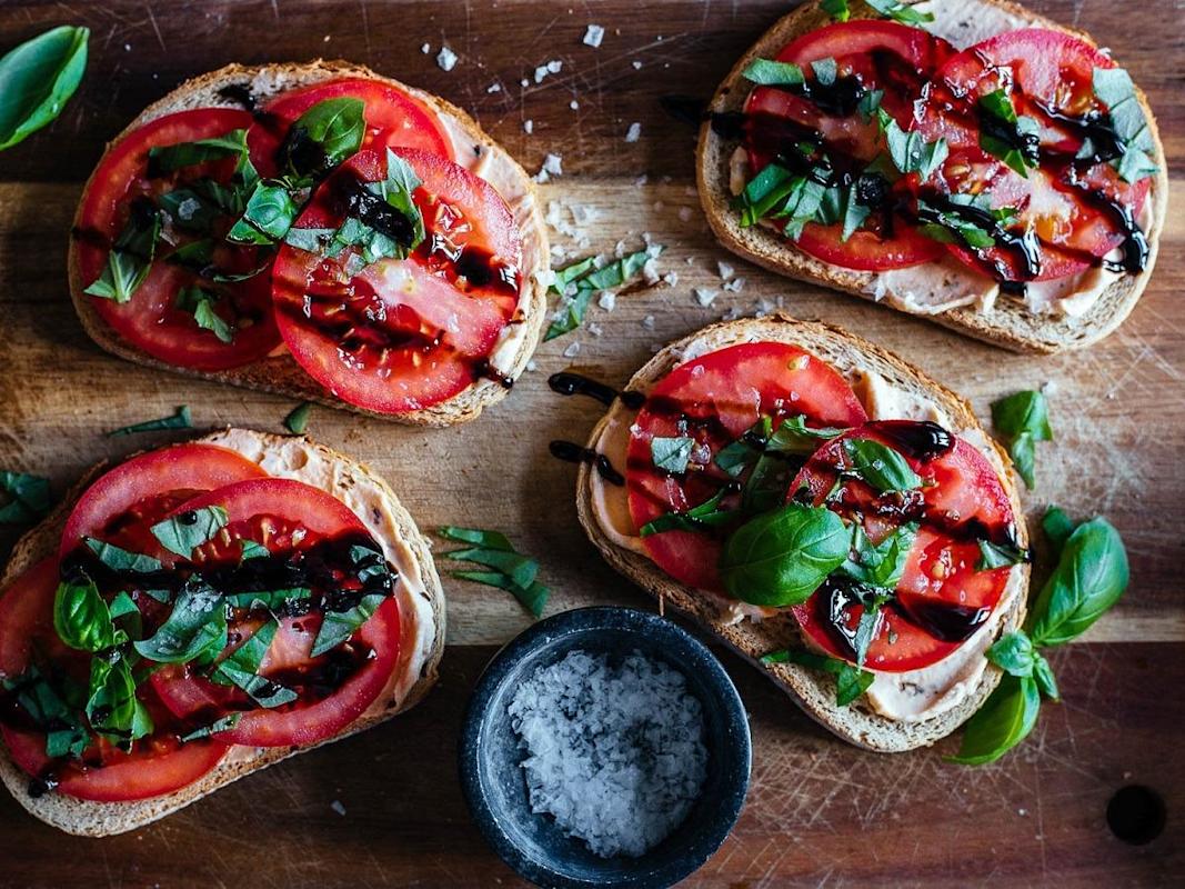 - Fördela tomatskivorna, färsk basilika och flingsalt på bröden.