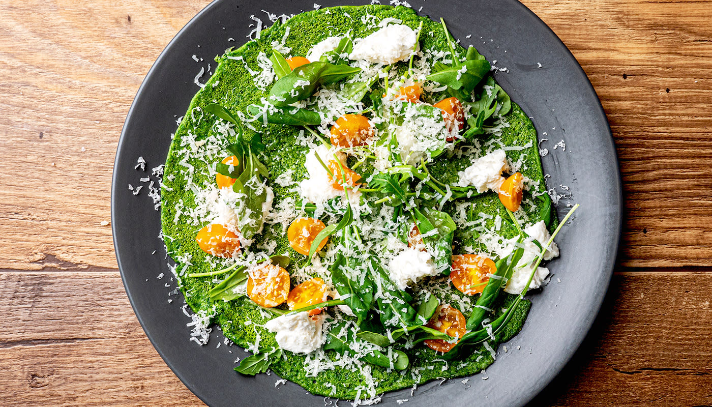 - Ota lautaselle ja levitä letun päälle ricottajuustoa, parmesanjuustoa, kirsikkatomaatteja ja rucolaa.