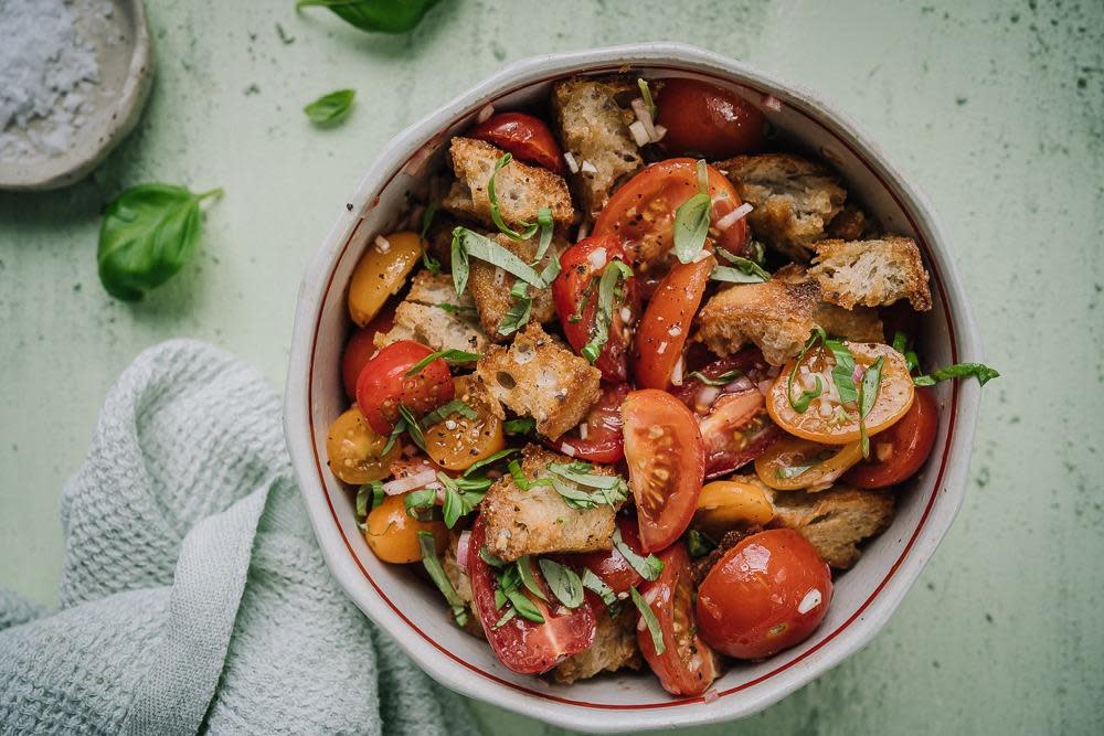 Laita tomaatit ja leipäkuutiot kulhoon ja sekoita joukkoon kastike. Viimeistele runsaalla määrällä hienonnettua tuoretta basilikaa. Anna salaatin tekeytyä 30 minuuttia ennen tarjoilua.