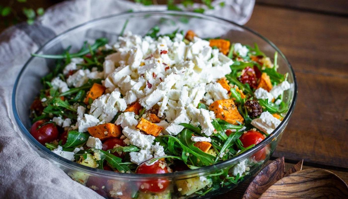 Lämmin bataatti- ja kvinoasalaatti kirsikkatomaateilla ja fetajuustolla, joka sopii täydellisesti lounaaksi tai lämpimän aterian lisukkeeksi.