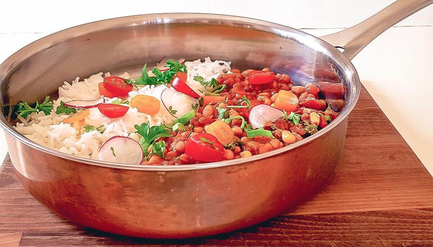 Chili sin carne annoksen voi hyvin lämmittää lounaaksi.
