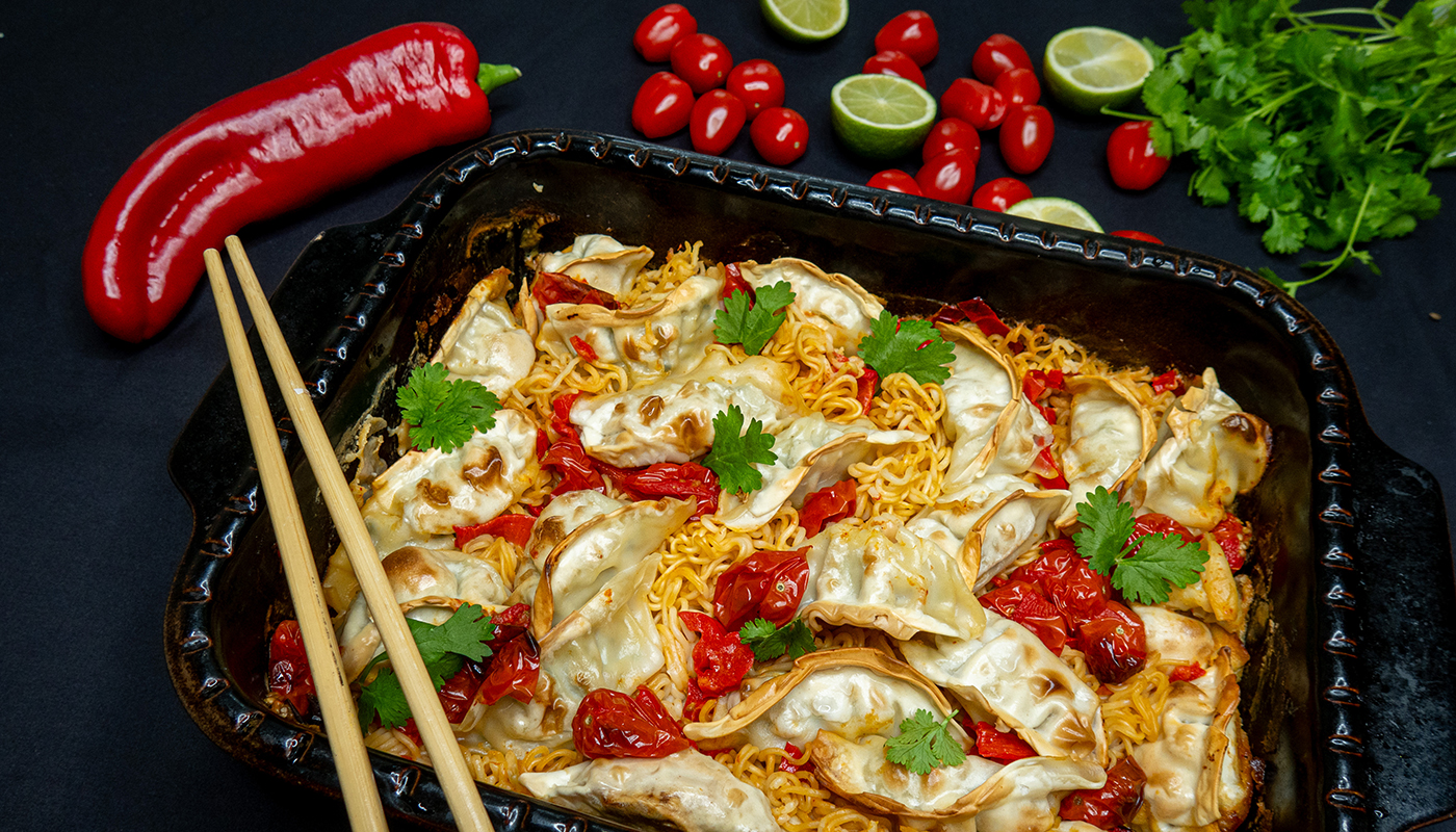 Dumpling-nuudelivuoka on herkullinen arkiruoka, joka yhdistää mehukkaat dumplingit, täyteläiset nuudelit ja maukkaan kastikkeen. Ruoka valmistuu vaivattomasti uunissa ja sopii hyvin koko perheelle tai jaettavaksi ystävien kanssa. Uunissa kypsyessään maut sulautuvat yhteen ja lopputuloksena on lämmin ja täyteläinen ruoka.