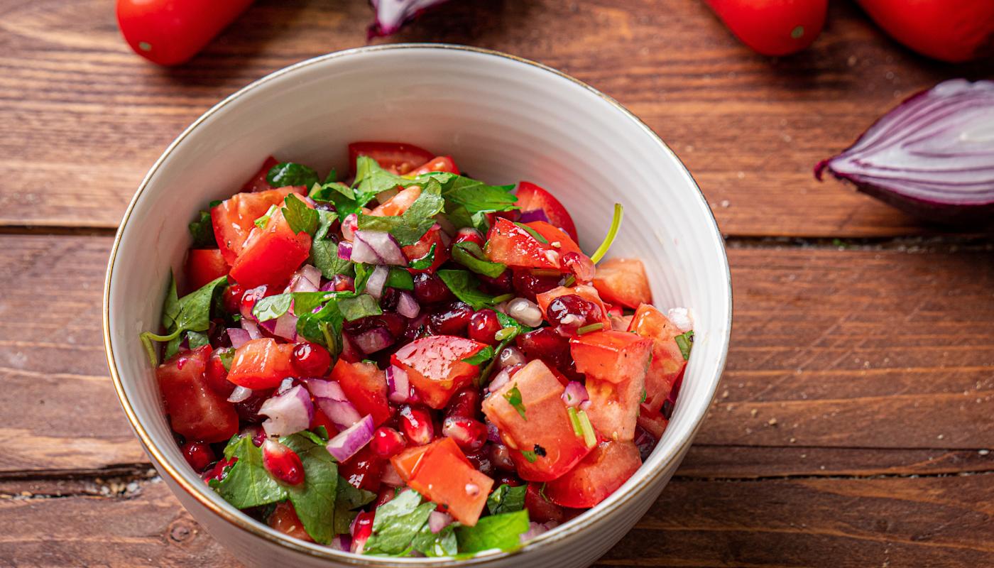 - Sekoita granaattiomenan siemenet, kuutioitu tomaatti ja hienonnettu punasipuli kulhossa.