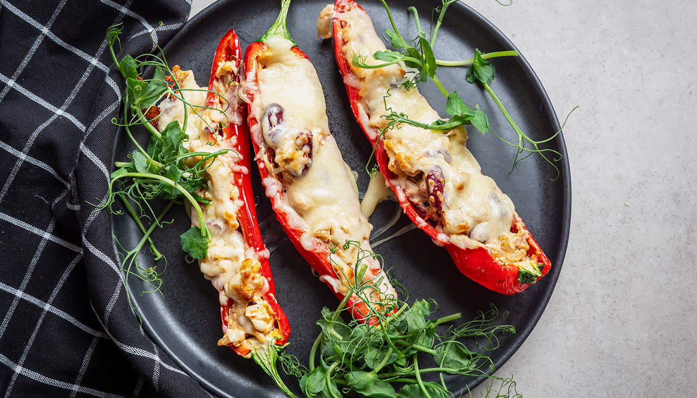 Asettele paprikat lautaselle ja koristele herneenversolla.
