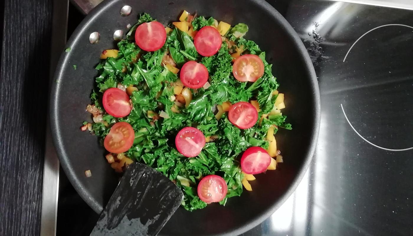- Hacka löken och fräs i olja, tillsätt grönkålen, gul paprika och tomat, krydda milt med salt och svartpeppar.