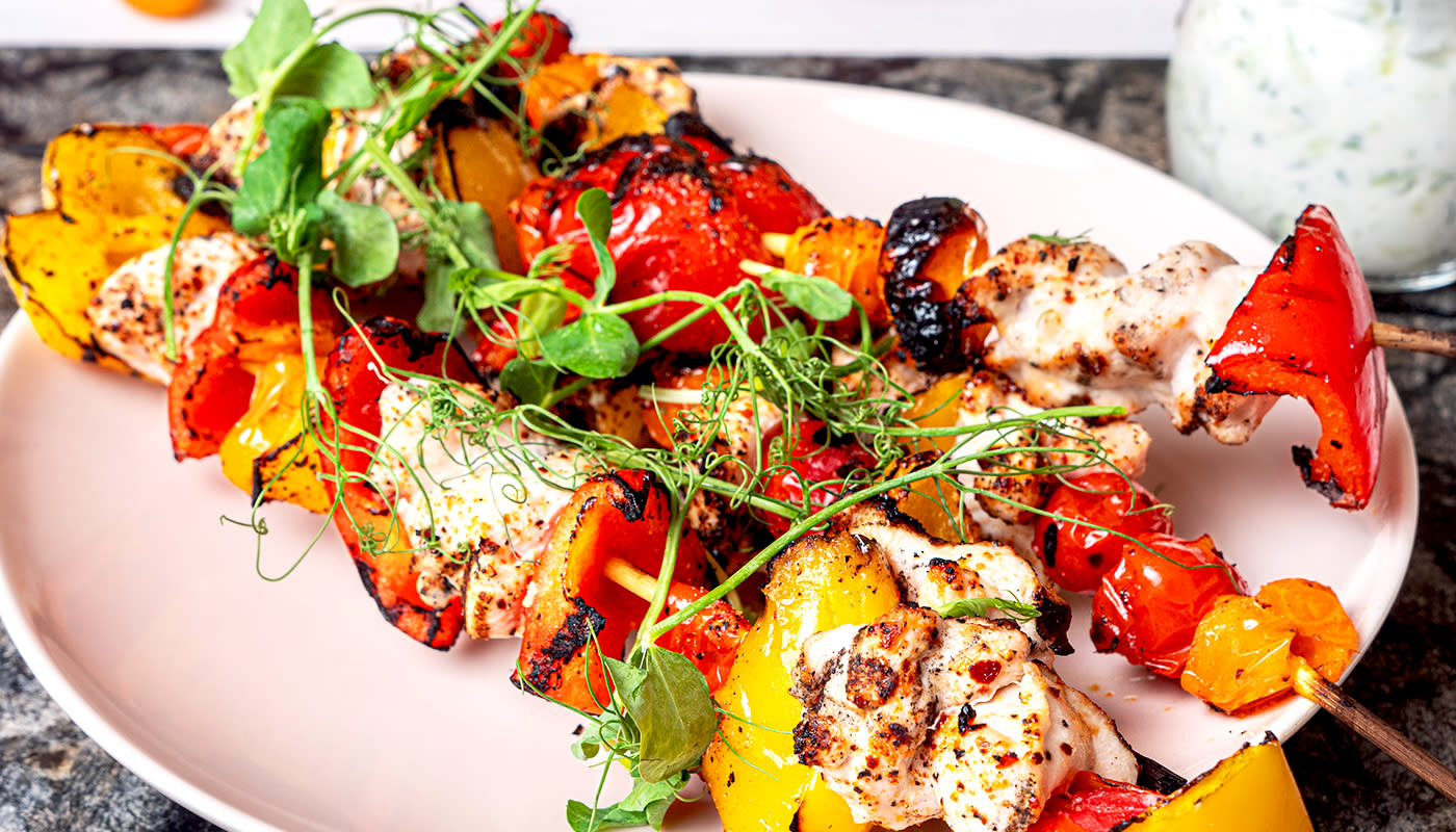 Kana- ja kasvisvartaat sekä tsatsiki – Maukasta grilliruokaa! Tarjoile kermaisen tsatsikin kanssa. Tämä ruoka on helppo valmistaa ja takaa upean makuelämyksen jokaisella grillikerralla. Täydellinen kesän illallisille ja juhliin!