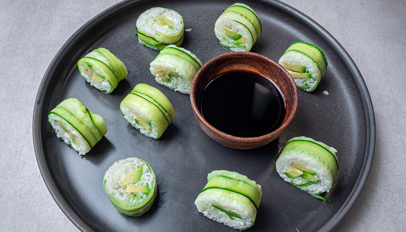 Näyttävät ja raikkaat kurkkusushit. Soveltuvat moneen eri tilanteeseen ja tarkoitukseen. Valmistele etukäteen ja laita jääkaappiin tekeytymään ja juuri ennen tarjoilu leikkaat suunpaloiksi.