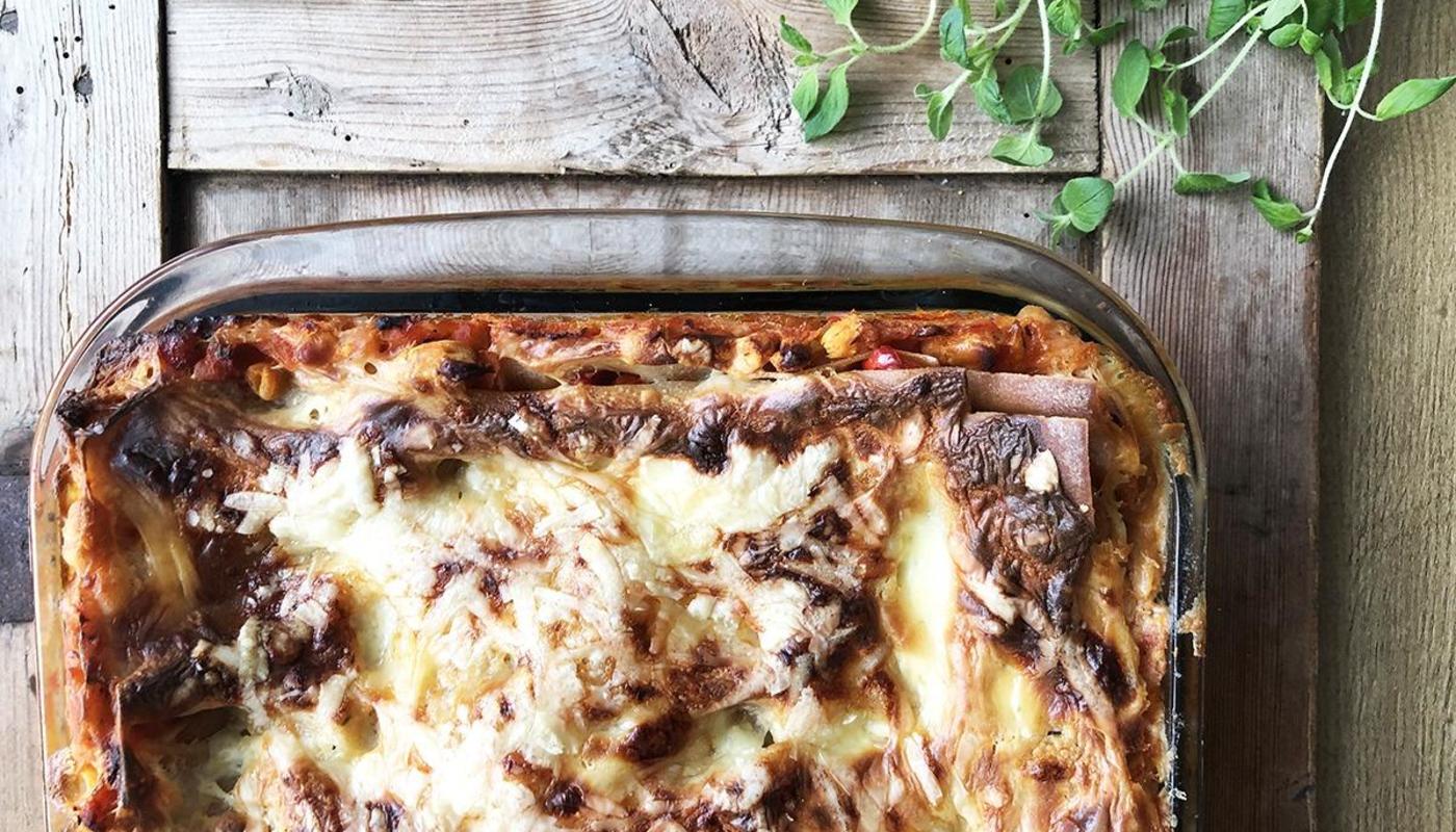 - Laita uunivuokaan vuorotellen lasagnelevyille papukastiketta ja juustokastiketta, juustokastikkeella aloittaen ja päättäen.