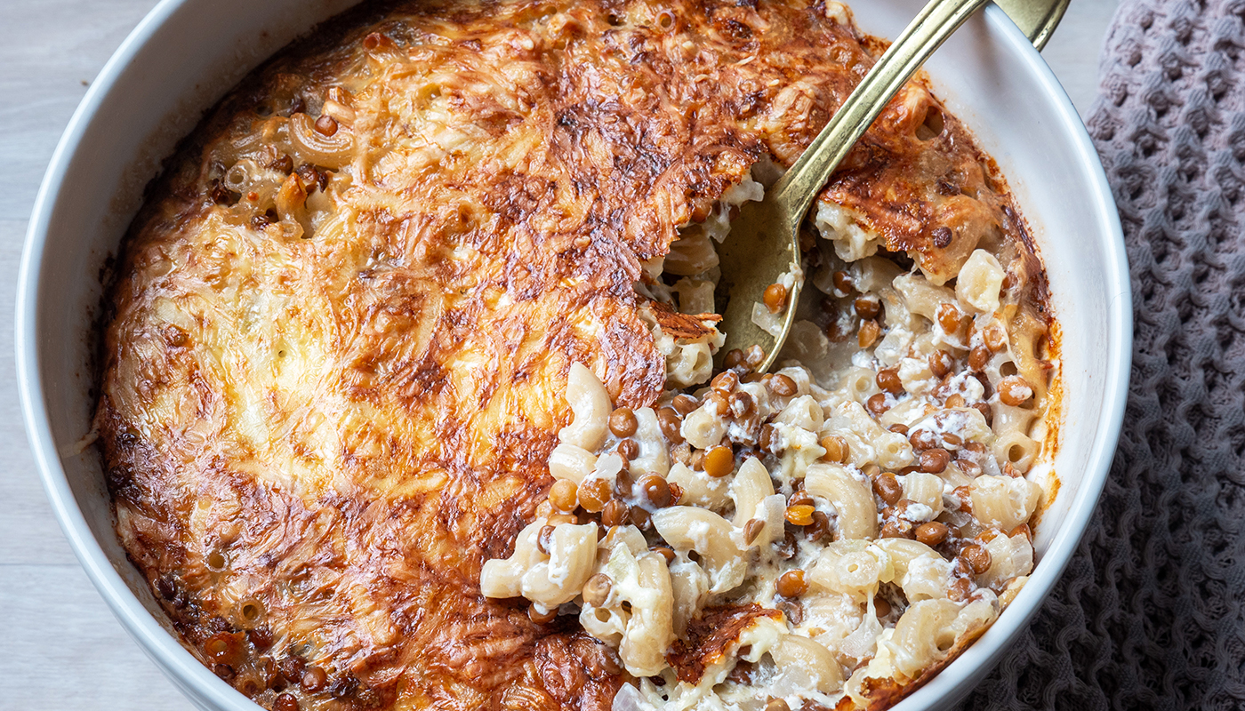 Siirrä makaroni-linssiseos voideltuun uunivuokaan.