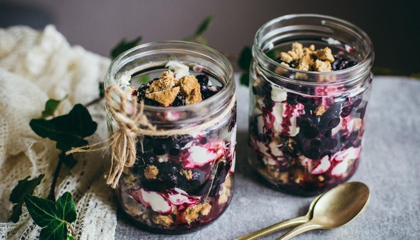 Tarjoile lasipurkista, hauska vaihtoehto mustikkacheesecakesta makeutettuna ainoastaan hunajalla.