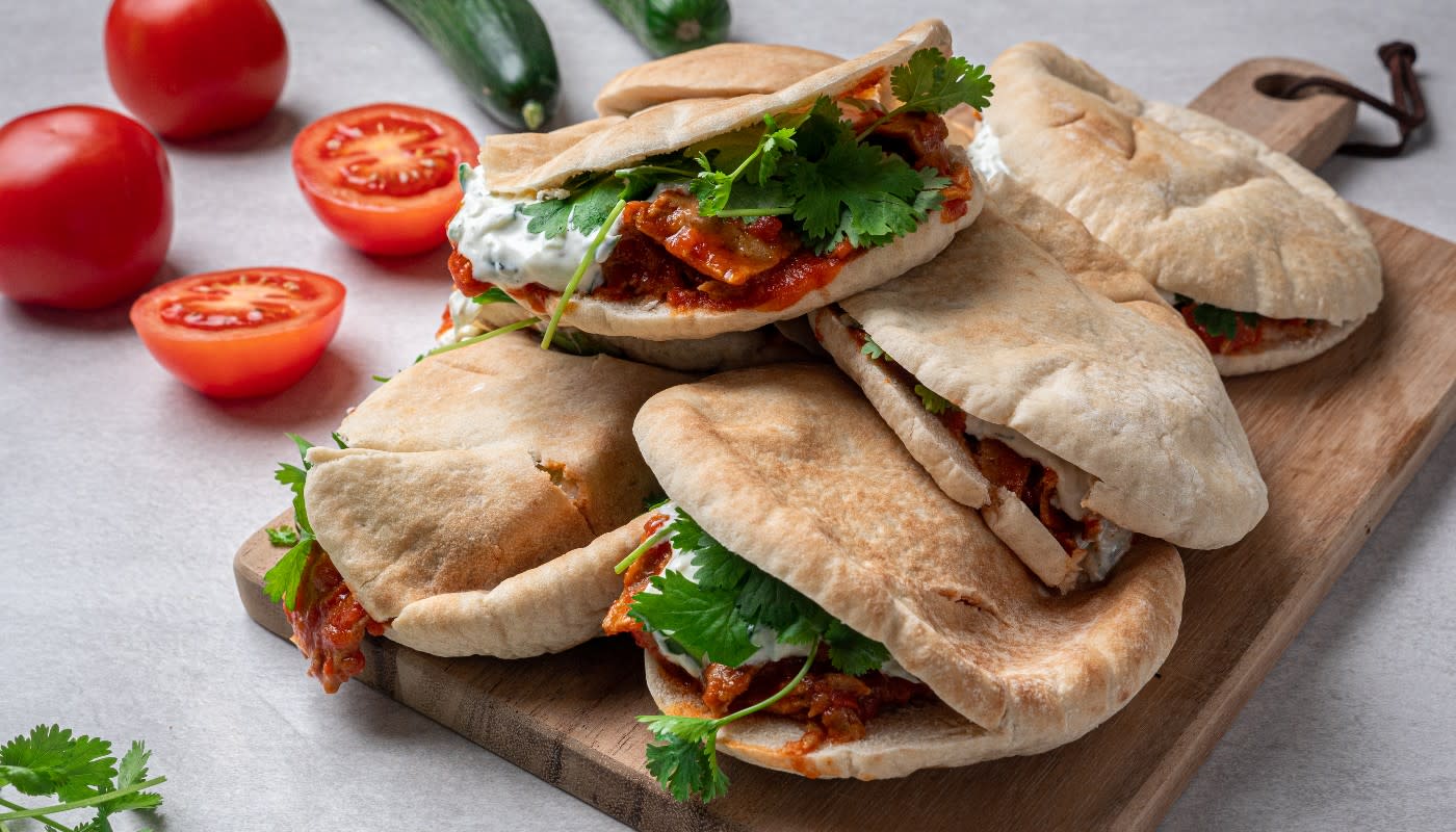 - Täytä lämmitetyt pitaleivät tomaattikastikkeen, tsatsikin ja tuoreen korianterin kanssa.