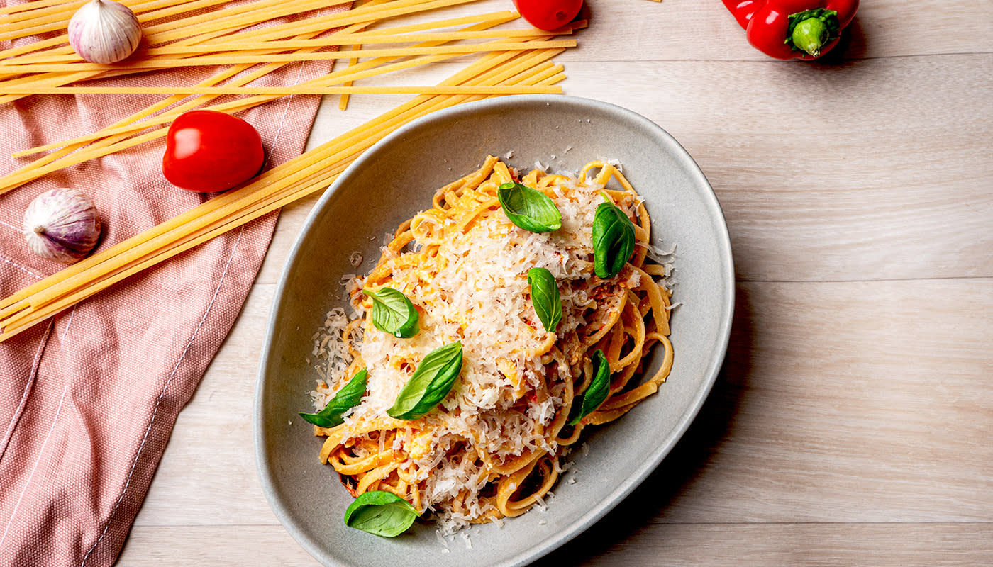 - Sekoita feta-paprika tahna spagetin joukkoon.