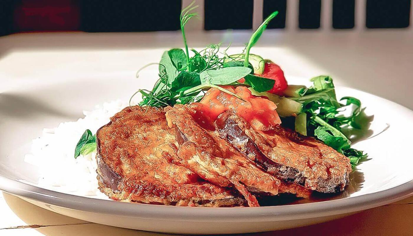 - Skär auberginen i tjocka skivor och panera först med vetemjöl och sedan i ost-ägg blandningen.