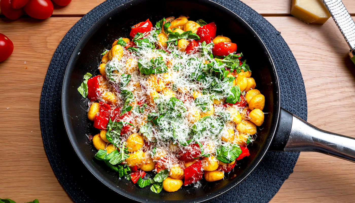 - Ruskista gnocchit pikaisesti paistinpannulla ja nosta sivuun.