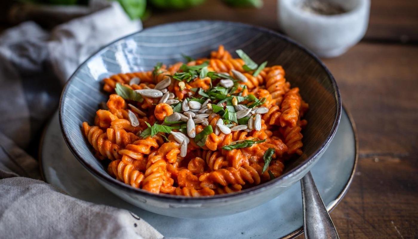 Täysin vegaaninen pasta-ateria ihanalla paprikakastikkeella.