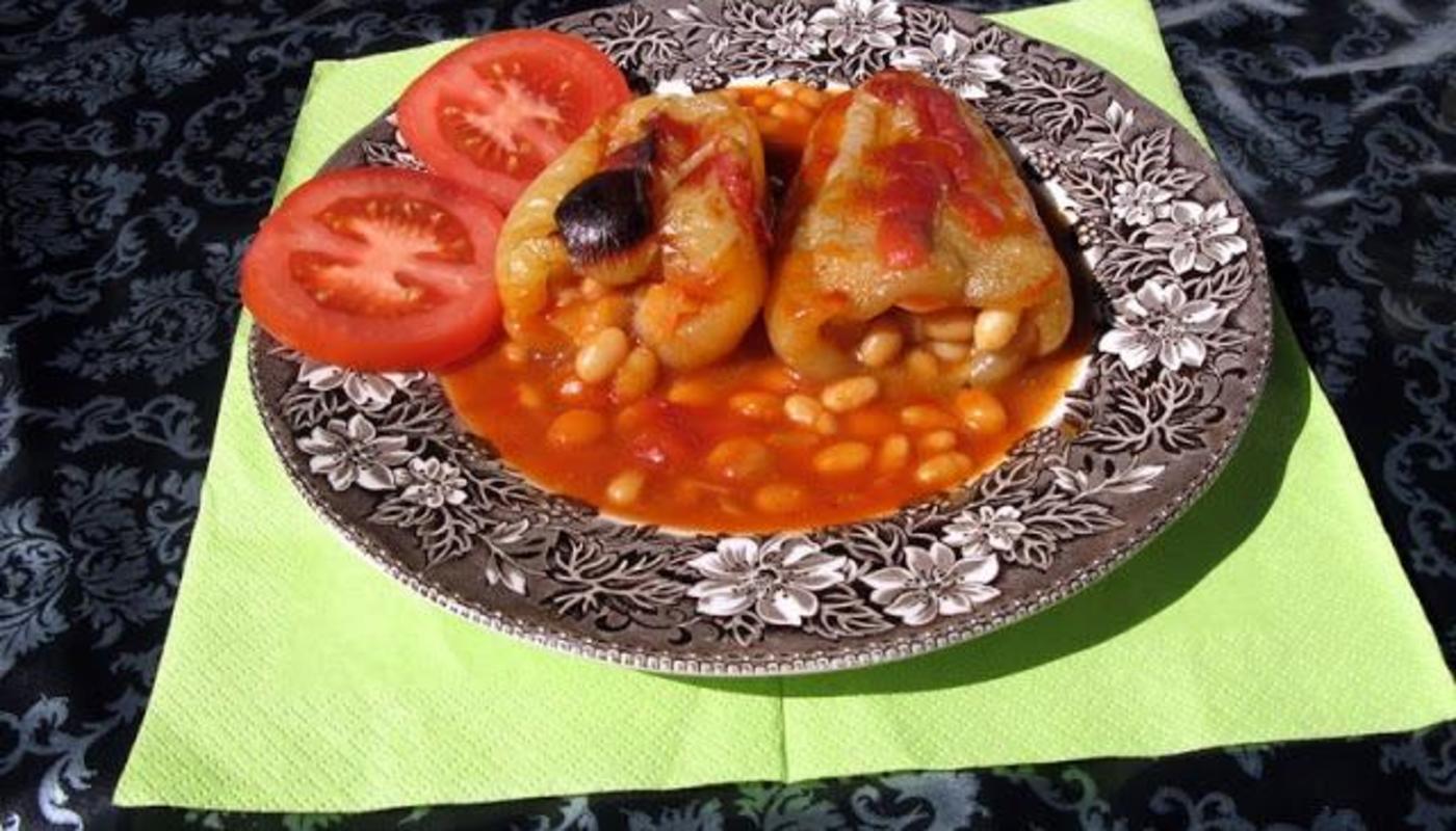 - Täytä paprikat papu-sipuliseoksella ja laita uunivuokaan. Valuta päälle paseerattua tomaattia.