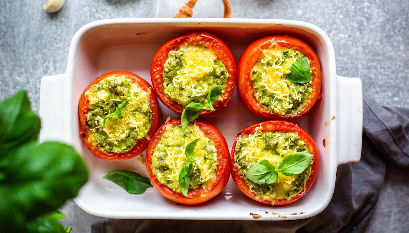 - Aseta tomaatit uunivuokaan ja täytä pestolla.