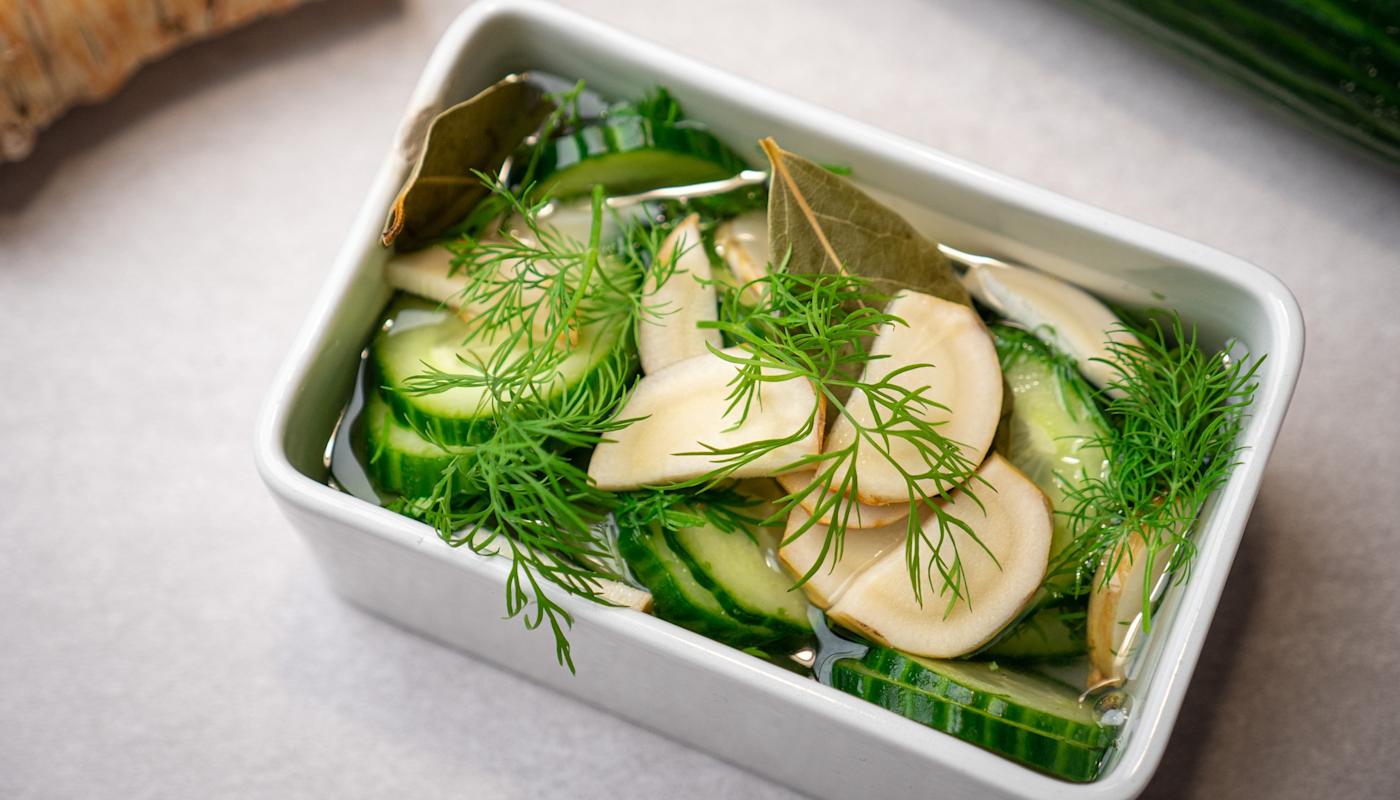 - Anna jäähtyä ja kaada mausteliemi kurkkusiivujen päälle.