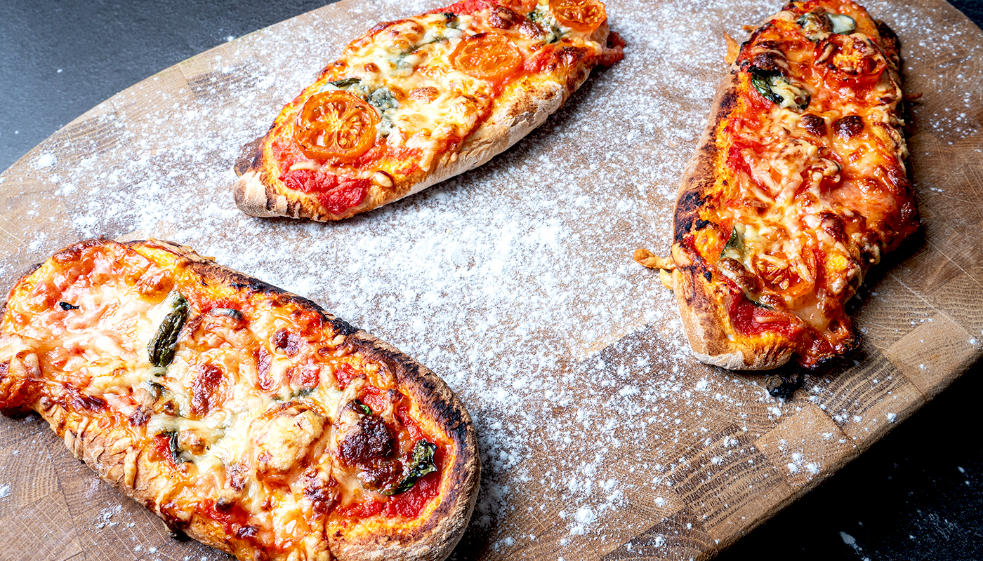 Levitä taikinoiden päälle pizzakastiketta, aseta kirsikkatomaattia, revi tuoretta mozzarellajuustoa ja basilikaa kastikkeen päälle.