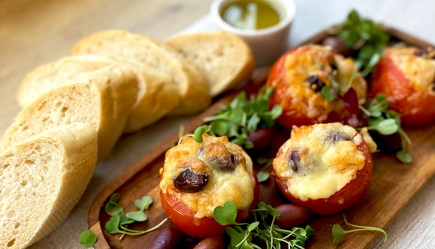 - Täytä tomaatit papumassalla, aseta kalamataoliivit sekä mozzarella raaste tomaattien päälle.