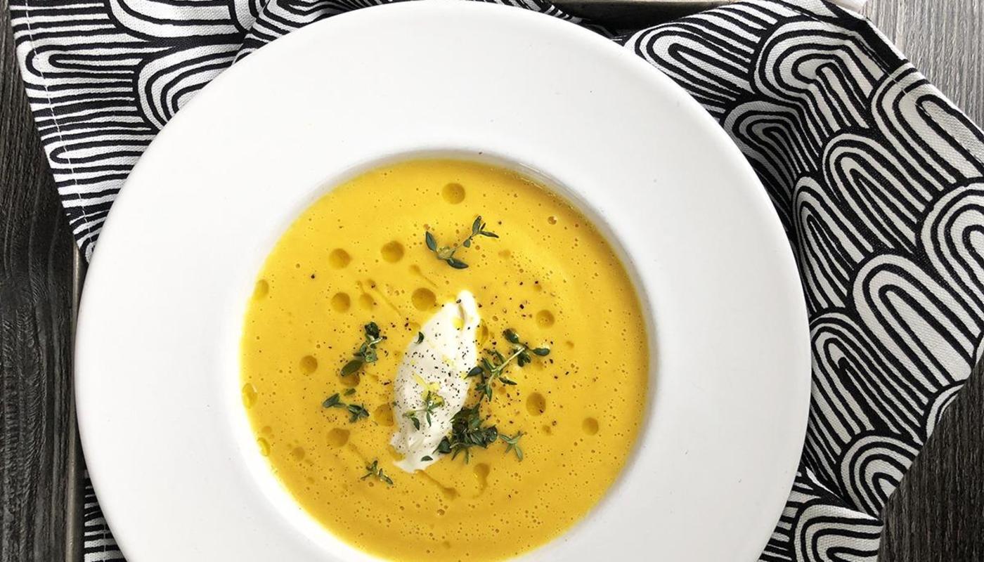 Aloita viikko ihanalla keltaisella porkkanakeitolla, joka saanut makunsa tuoreesta timjamista, tähtianiksesta ja appelsiinista!