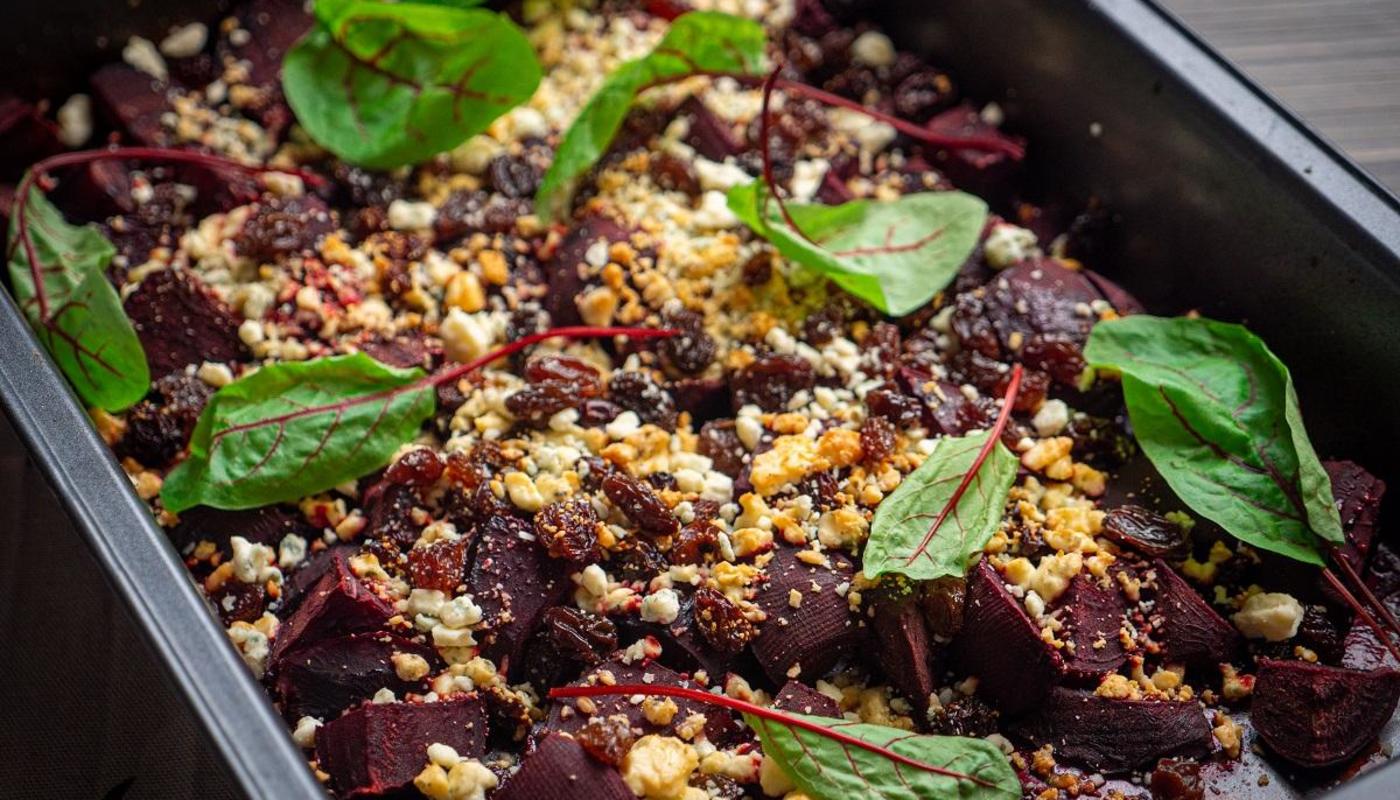- Lisää punajuurten päälle sinihomejuustomuru ja rusinat.