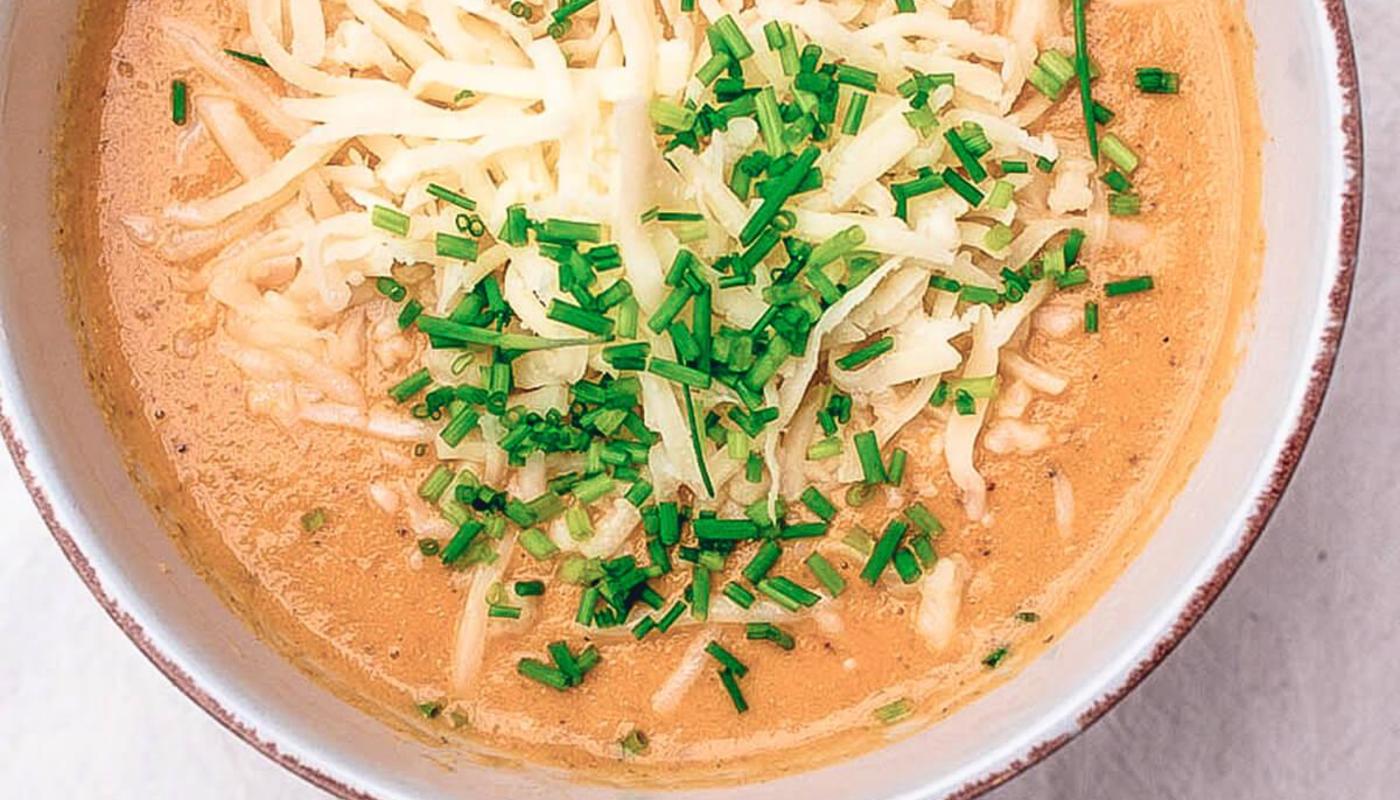 - Sätt lite riven ost och färsk gräslök ovanpå soppan.