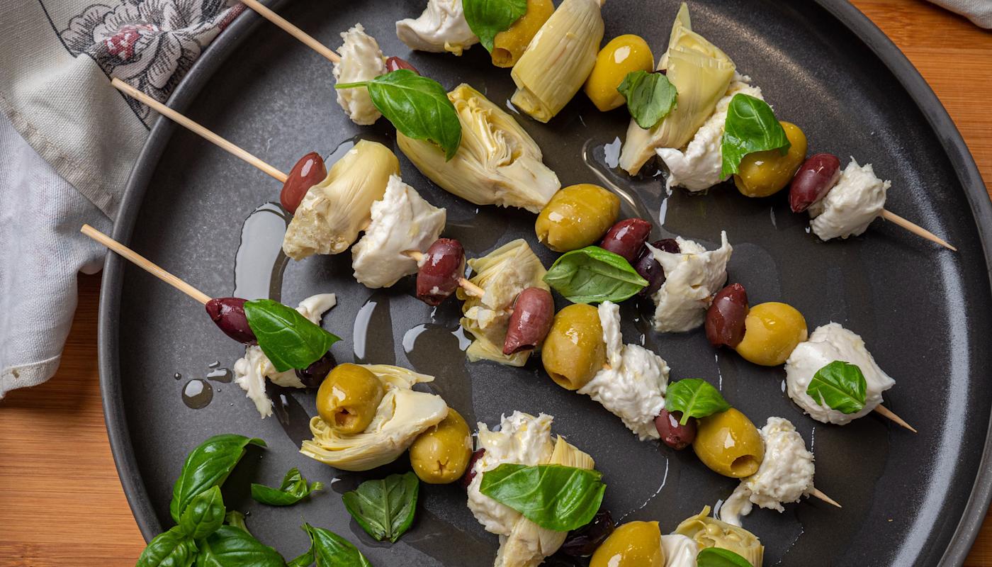- Lägg om vartannat oliver, mozzarellaost och kronärtskocka på spetten.