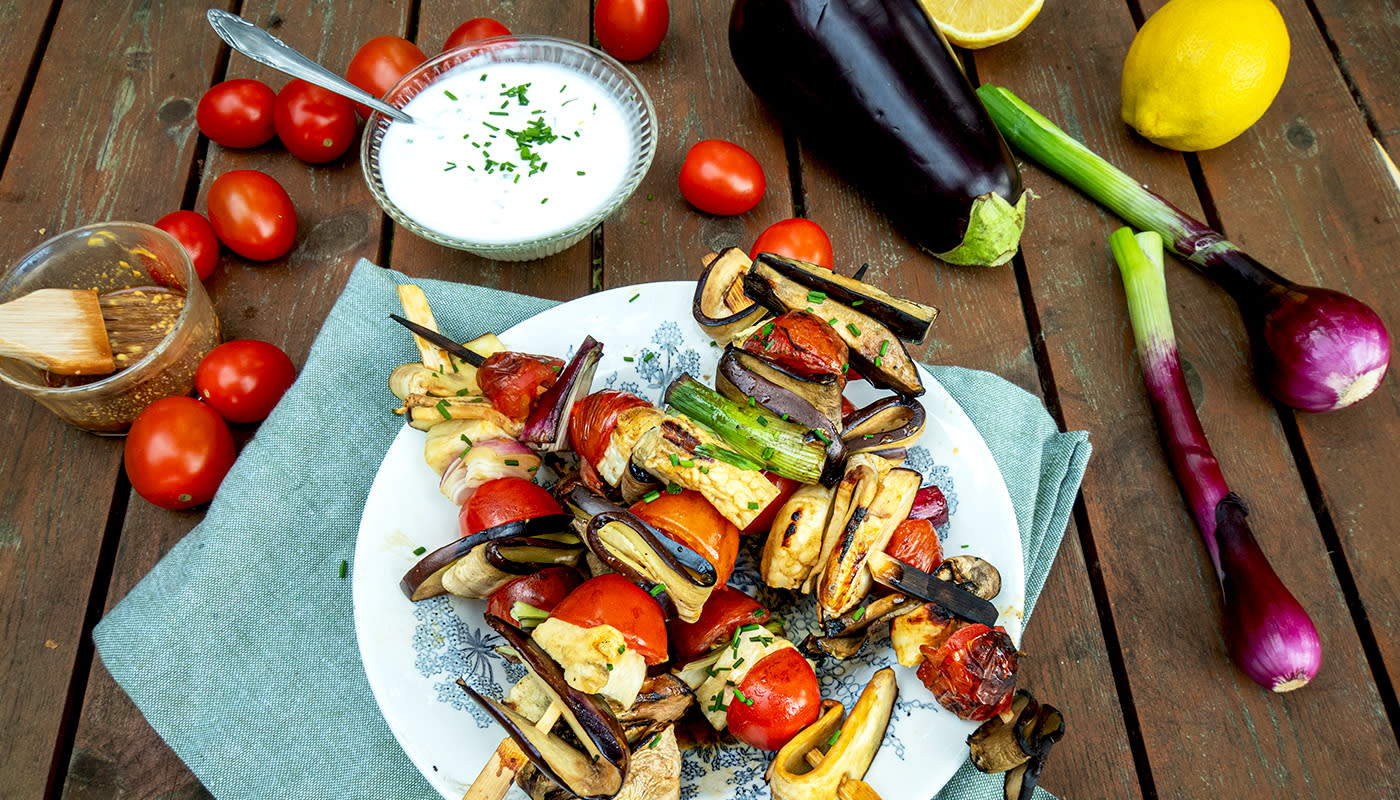 - Trä ihop spetten genom att varva aubergine, halloumi, lök och tomater.