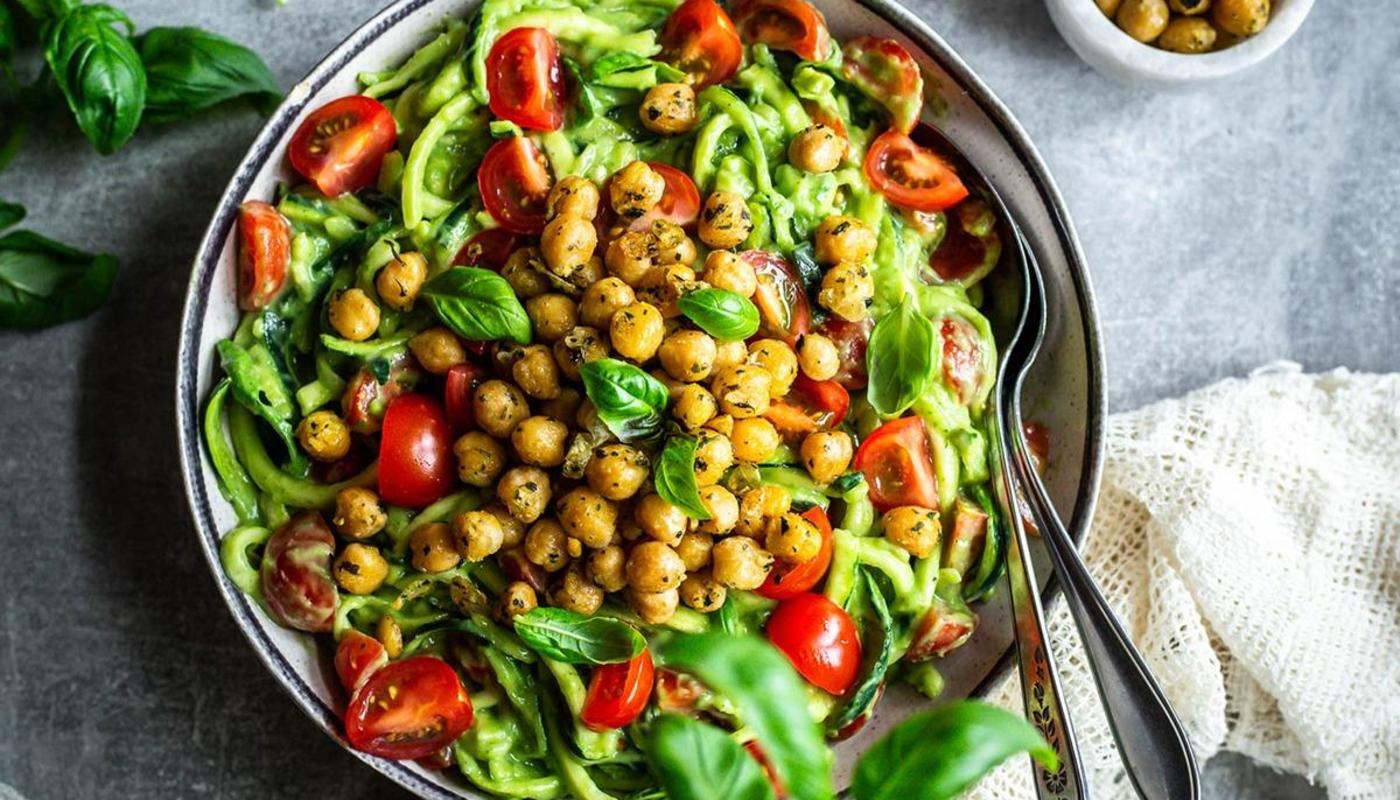 - Servera avokado-zucchinipastan med färsk basilika och rostade kikärter.