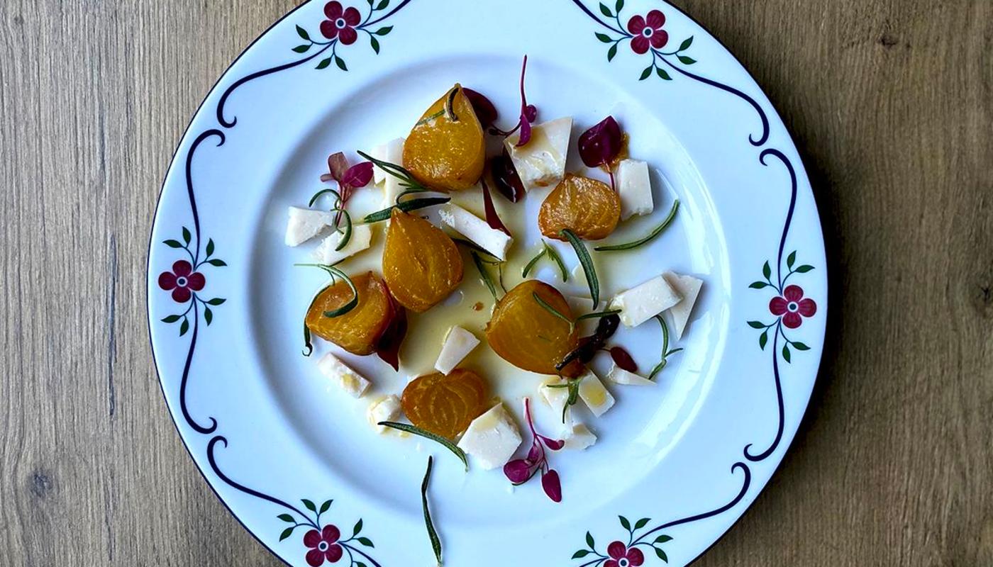 ” Al dente” bakad gulbeta, serverad tillsammansmed en kraftig, lagrad getost och med fräscha färggranna salladsskott.