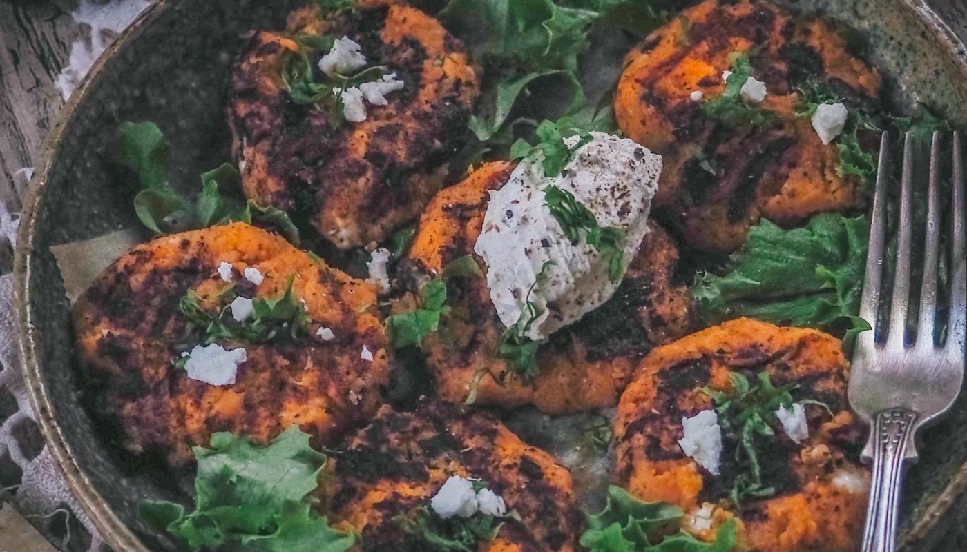 Suolainen feta ja makea bataatti ovat kyllä pettämätön yhdistelmä ja massasta saa tehtyä aikamoisen määrän kasvispihvejä. Mitä pienempiä, sitä helpompia paistaa ja pysyvät paremmin koossa. Oikeastaan parempi tehdä pihvimassa edellisiltana jääkaappiin mehevöitymään ja paistaa satsi seuraavana päivänä