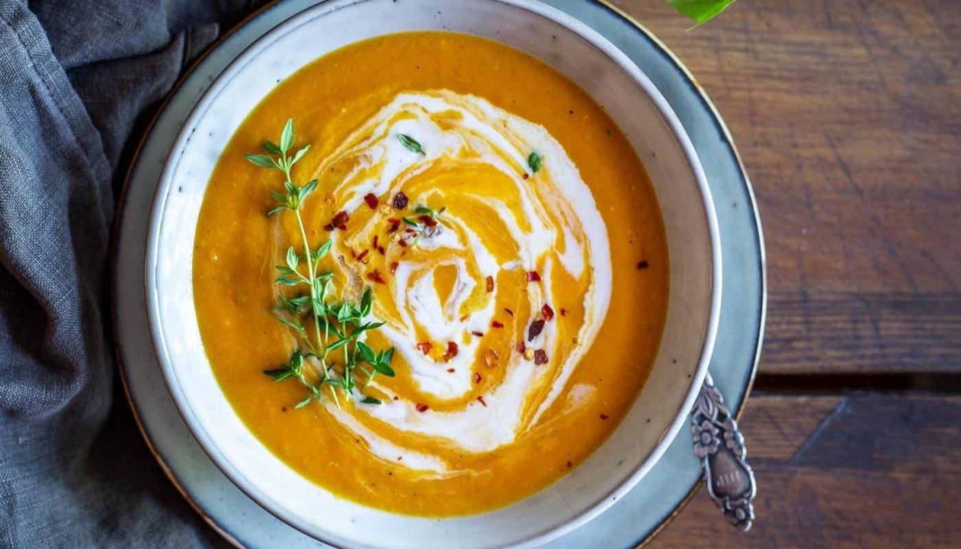 En fyllig och mättande batatsoppa med tomat som både passar som förrätt och varmrätt.