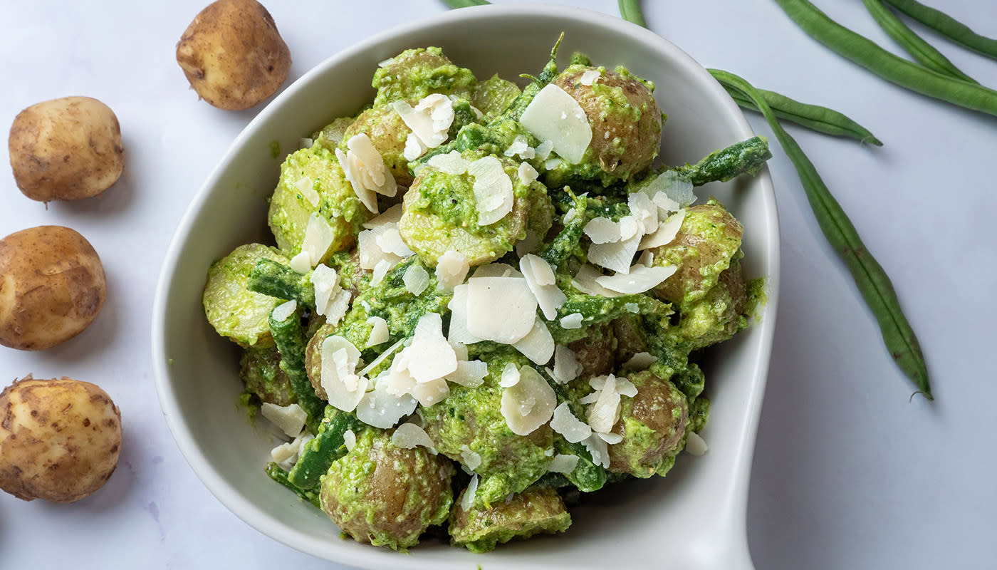 - Blanda potatisarna med resterande bönor och pestodressingen.