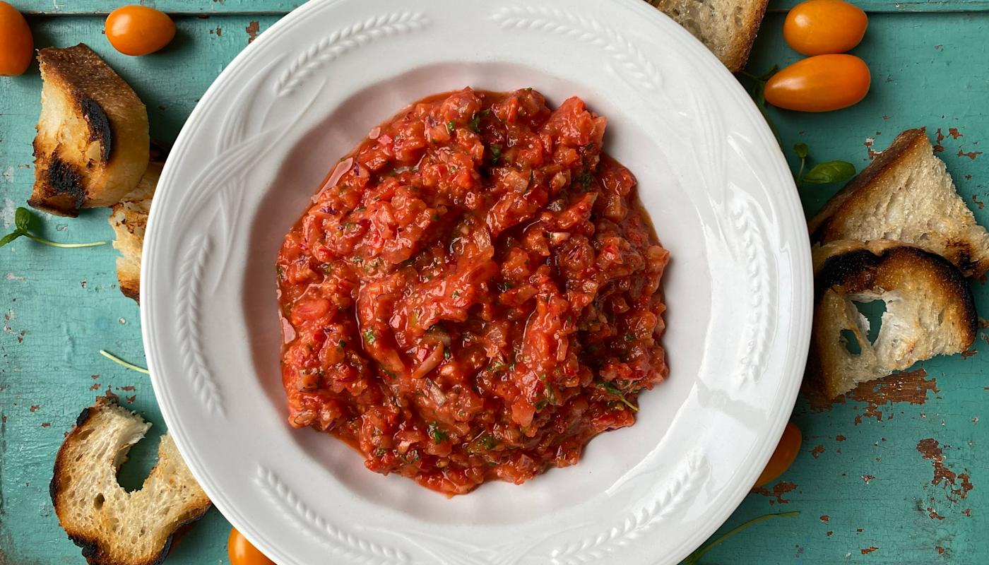 Fin turkisk Meze gjord på inhemska fina råvaror. Grönsakerna finhackas för hand med kniv istället för med mixer, vilket ger trevlig struktur åt blandningen. Tips om man vill spara röran några dagar: förvara i en sil så rinner överflödig vätska bort, och röran håller fin konsistens.