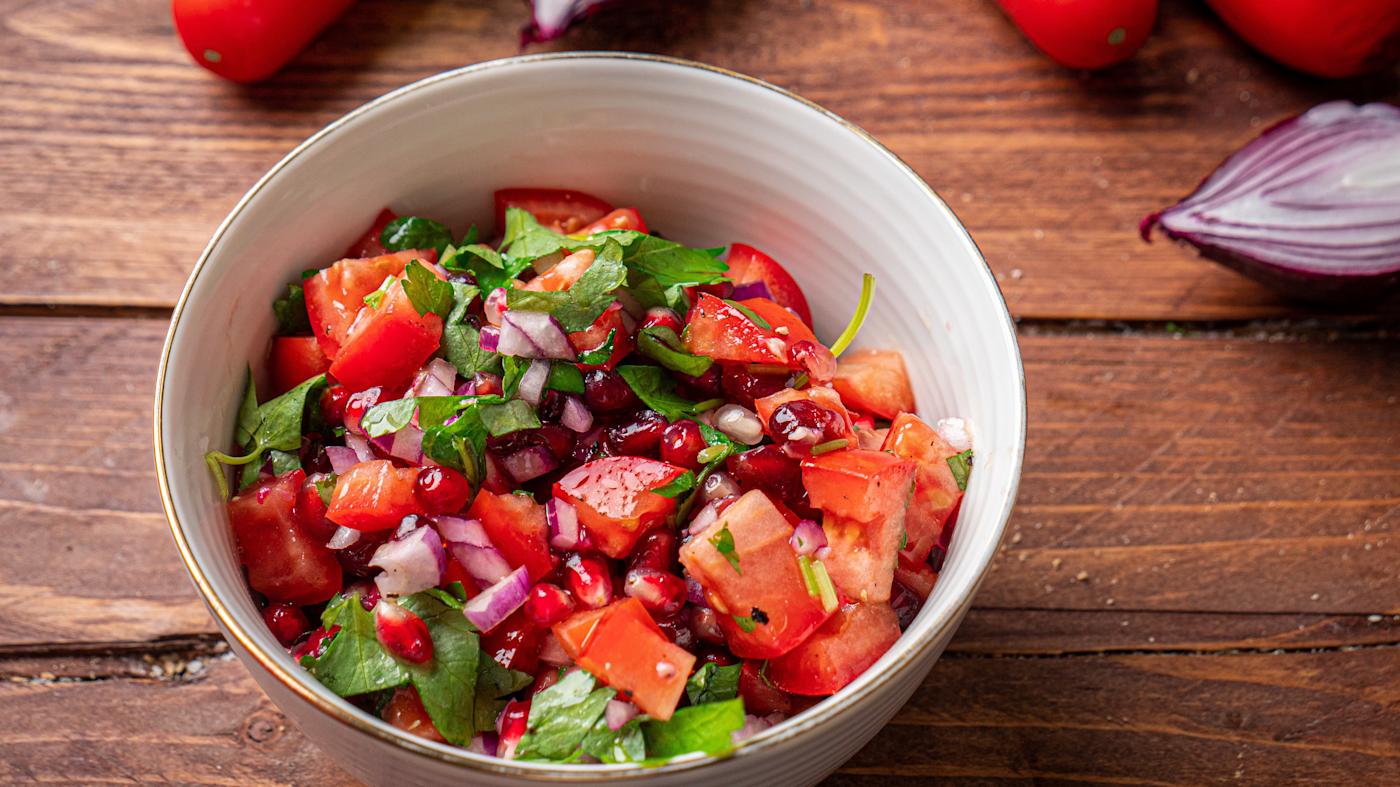 Blanda kärnorna från granatäpplet, tärnad tomat och hackad rödlök i en skål.