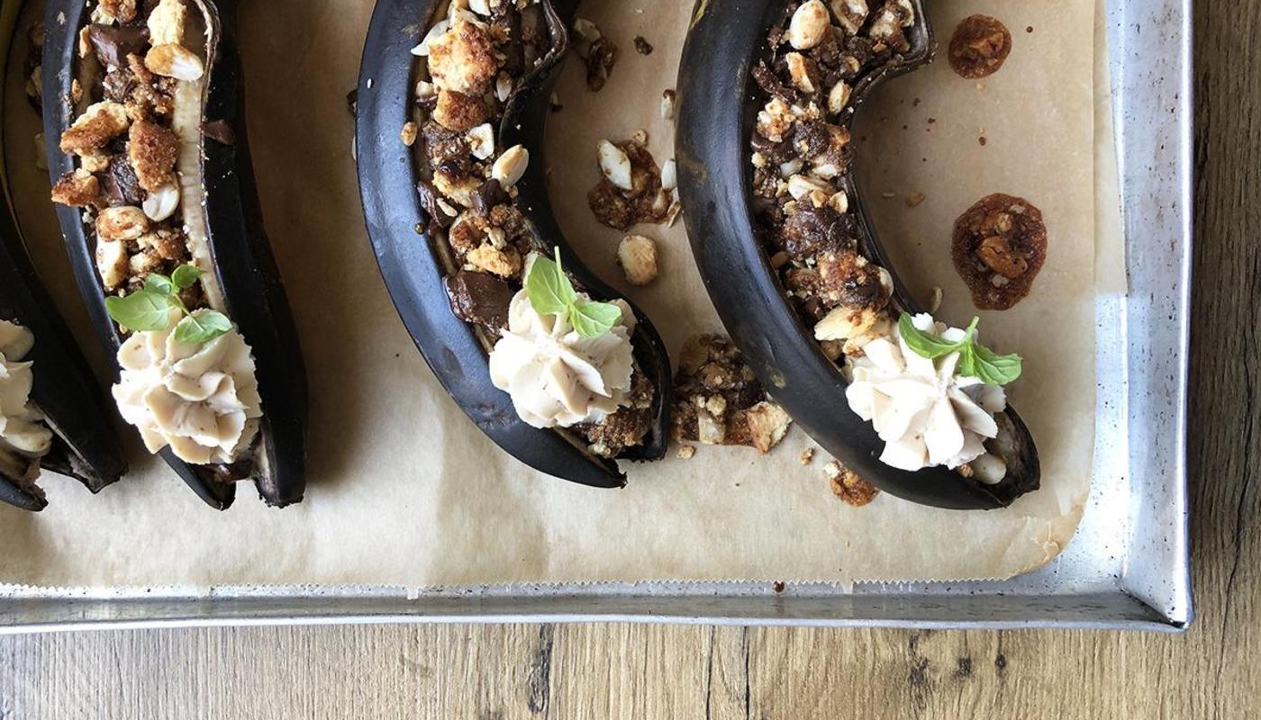 - Skär en lång skåra längs med bananerna, fyll skåran med blandningen.