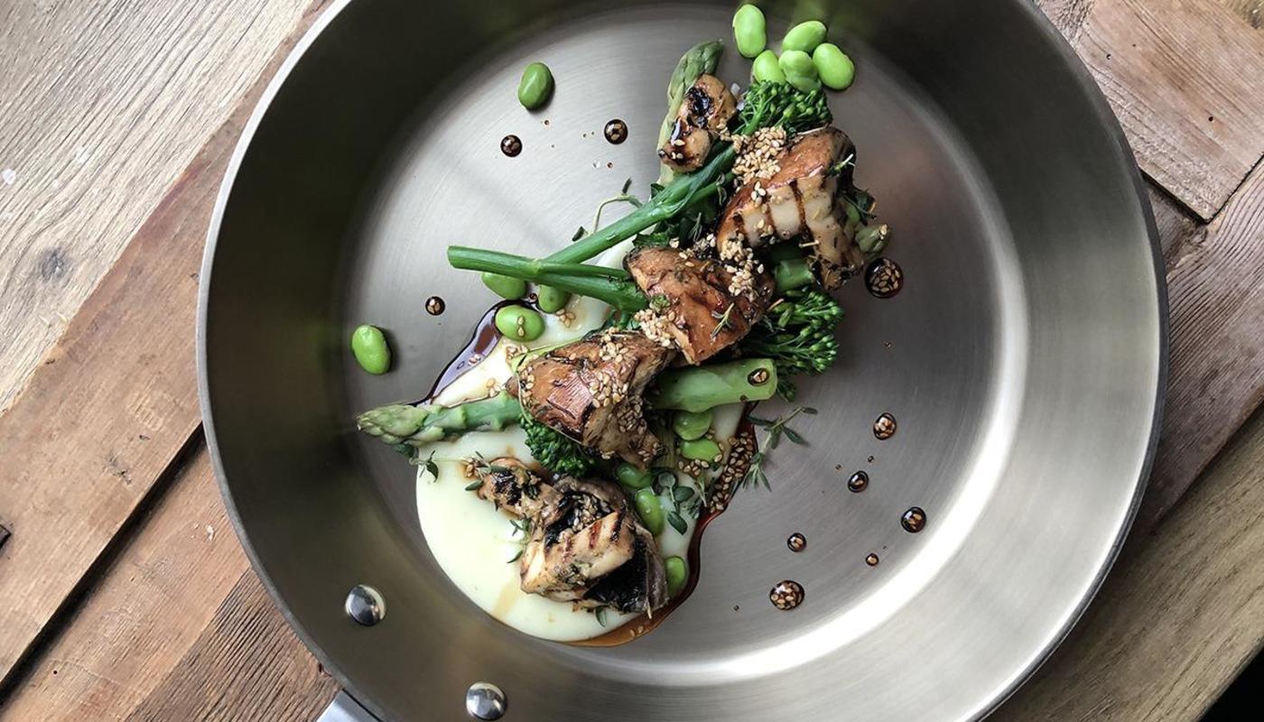 En lyxigare vegansk måndag! Servera den grillade portabellosvampen med sojasirap, potatispure och härliga gröna grönsaker!
